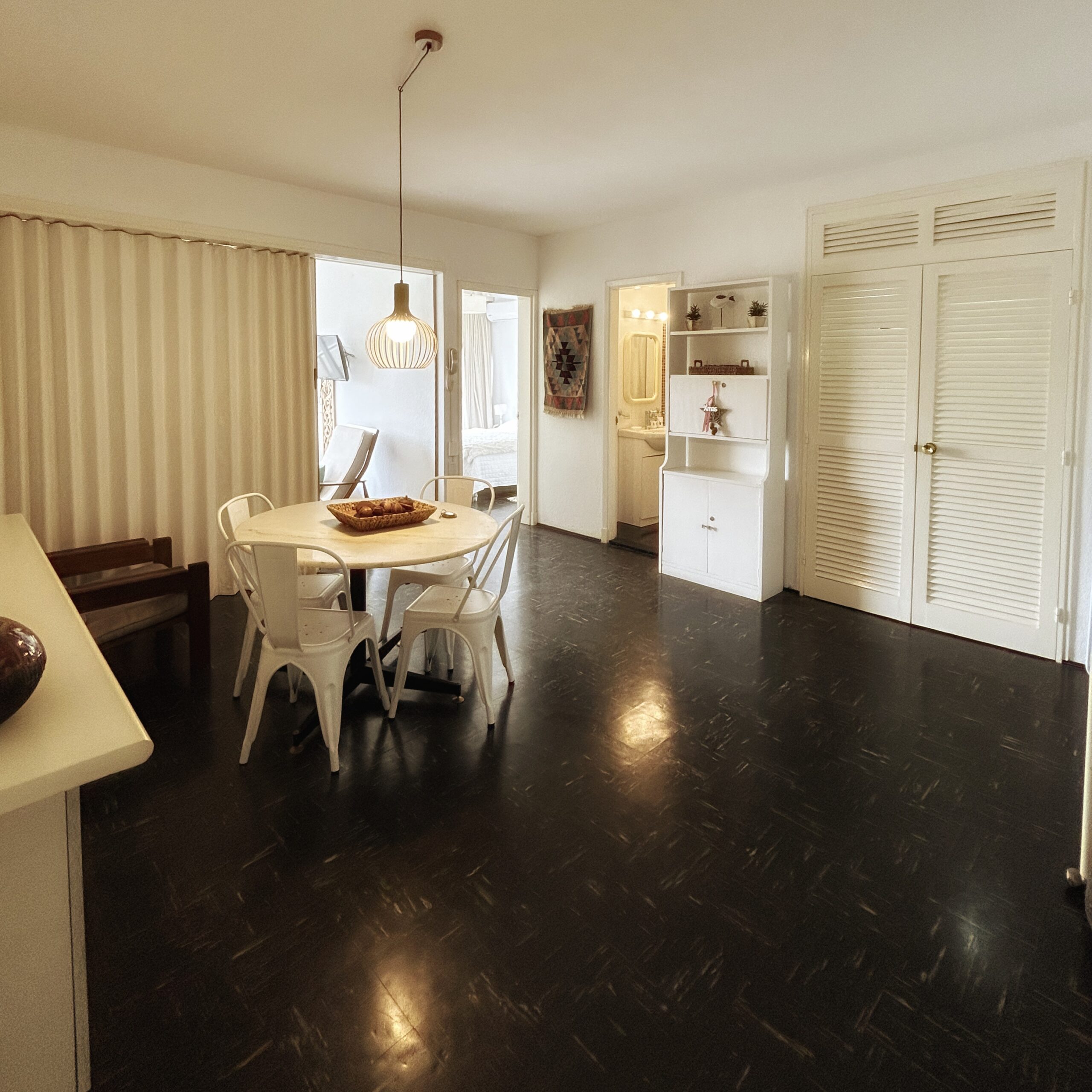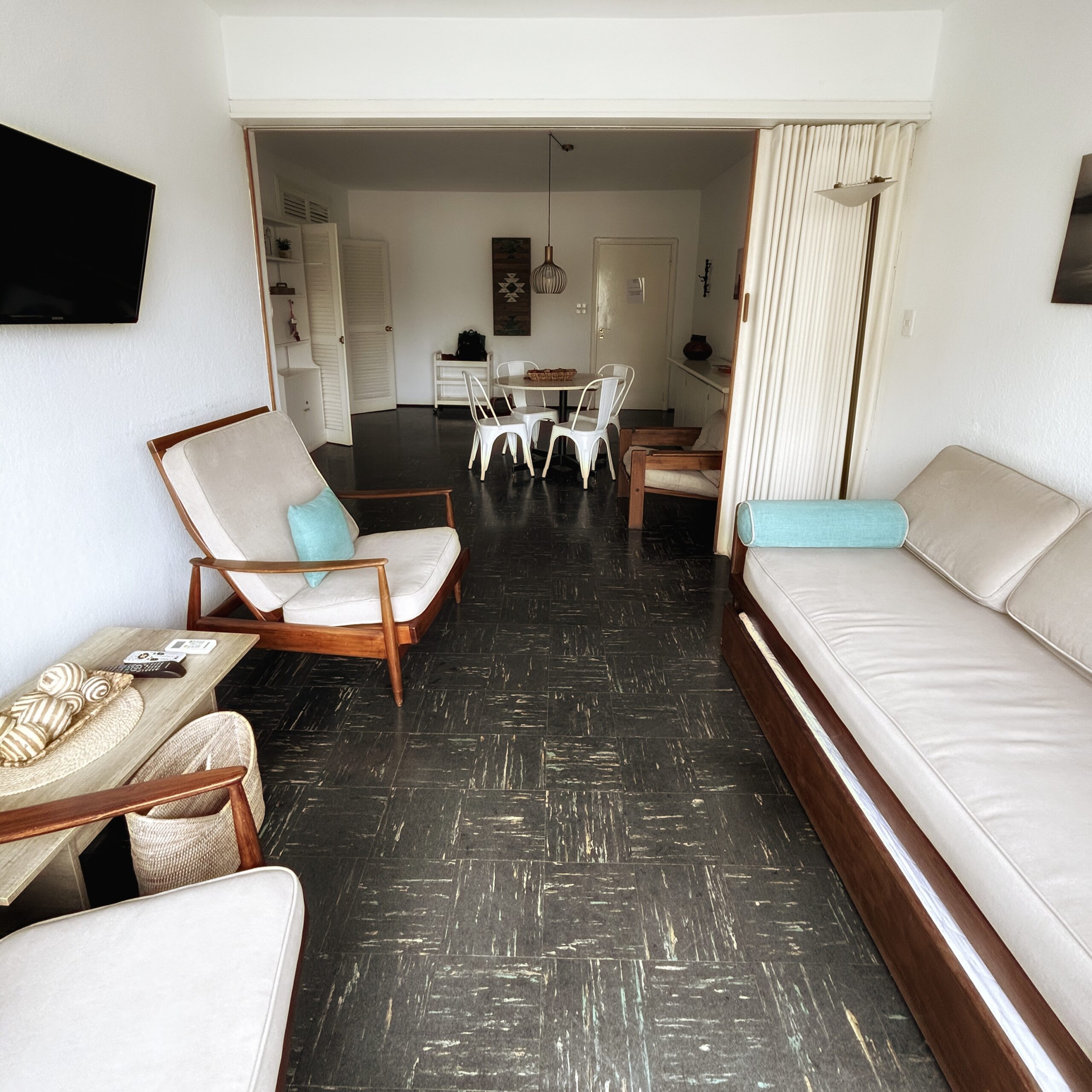 Amplio living comedor con pisos pulidos, aire acondicionado, TV cable y mobiliario.