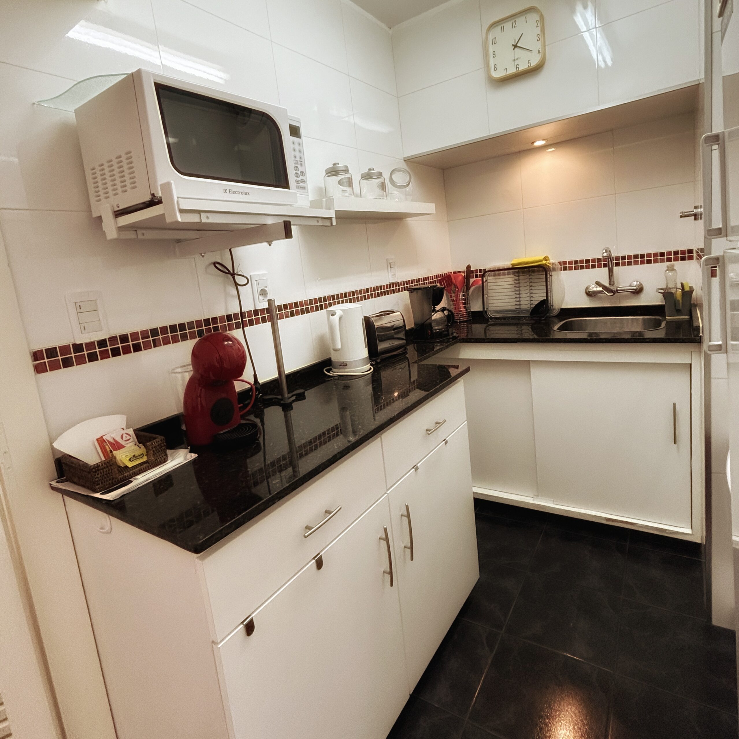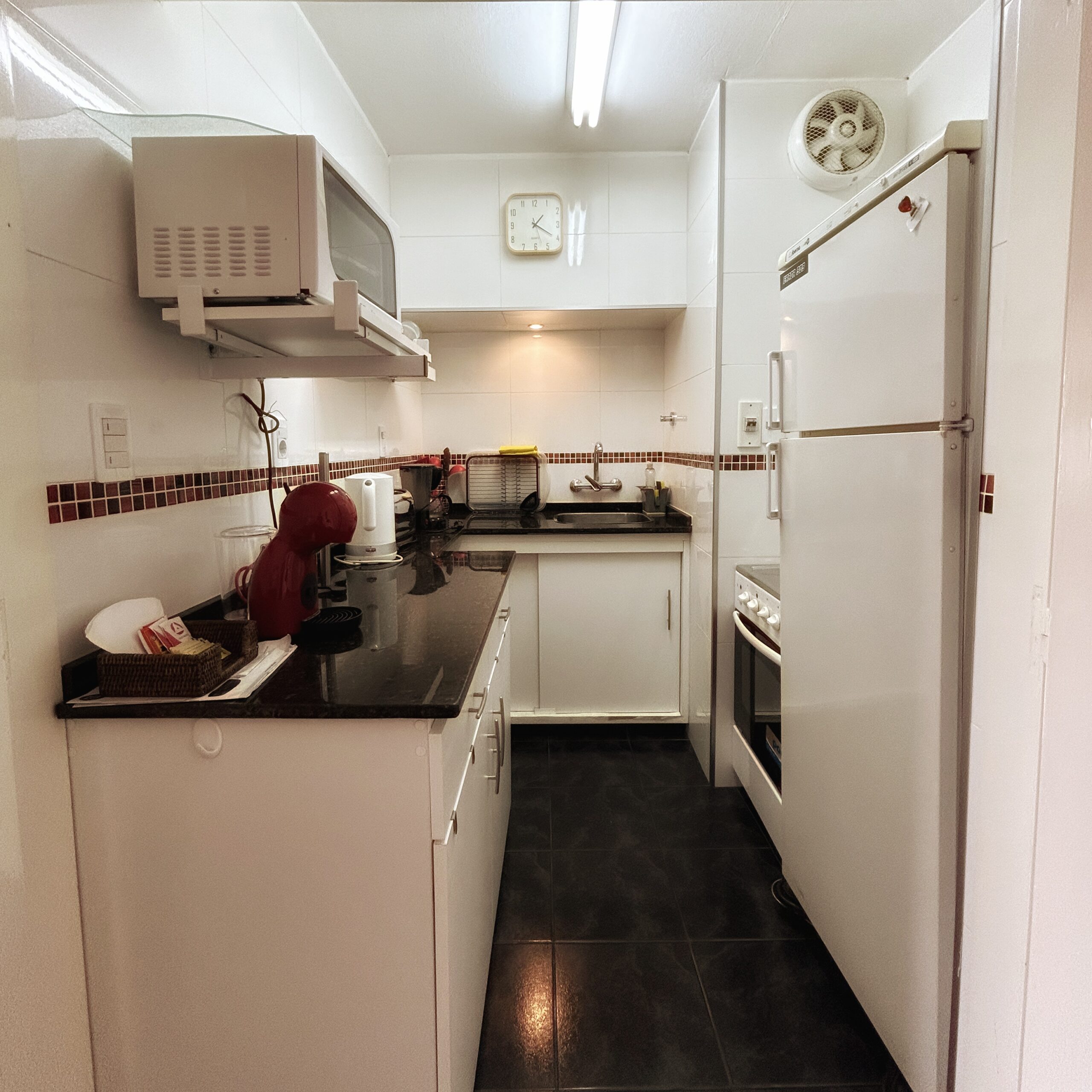 Cocina totalmente equipada con heladera, cocina, microondas, extractor y pequeños electrodomésticos.