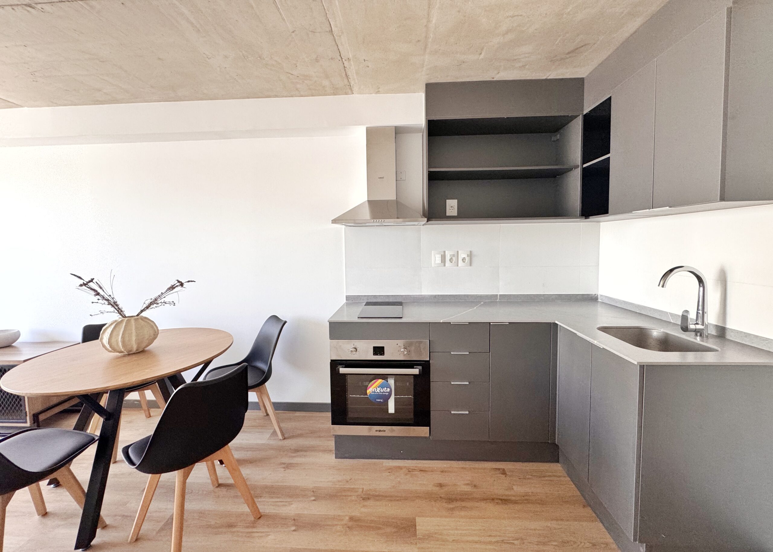 Cocina integrada con muebles aéreos y bajo mesada